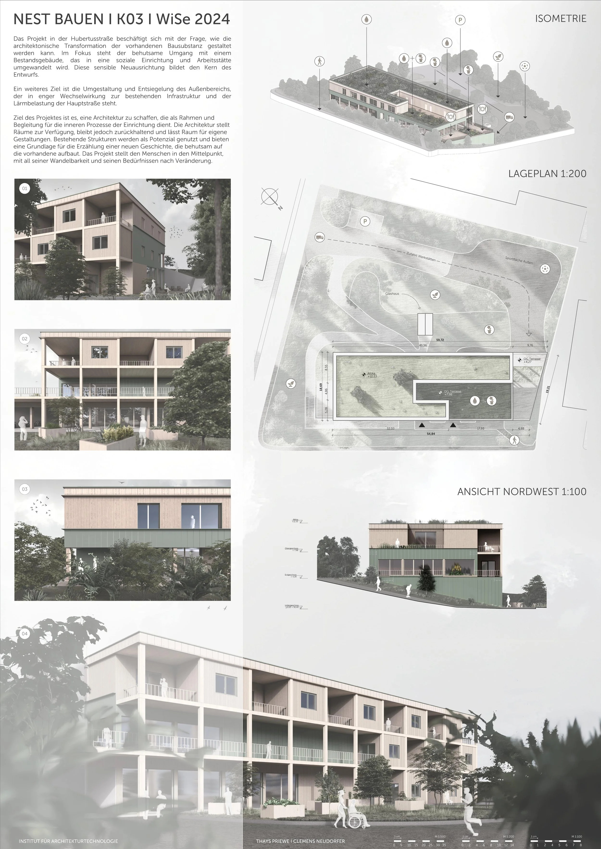 Im sechsten Semester bestand die Aufgabenstellung darin, für das im vorherigen Semester entworfene Projekt die Polierplanung auszuarbeiten. Dies umfasste die detaillierte Durcharbeitung konstruktiver Anschlüsse, Fassadenschnitte sowie die Entwicklung durchdachter baulicher Abläufe. Ergänzend wurde der Entwurf bis auf die Ebene der Ausführung präzisiert, um die Umsetzbarkeit der architektonischen Idee sowie das Zusammenspiel von Konstruktion, Materialität und Bestand nachvollziehbar darzustellen.